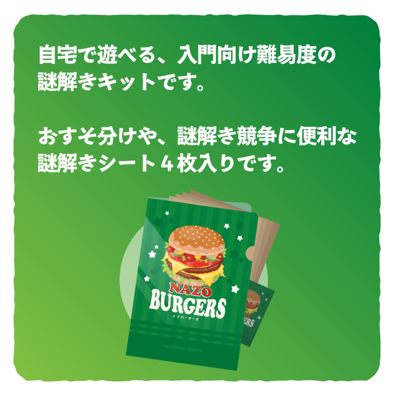 架空のハンバーガーショップ「ナゾバーガーズ」のトレイシートがコンセプトの、初心者向け謎解きです。
