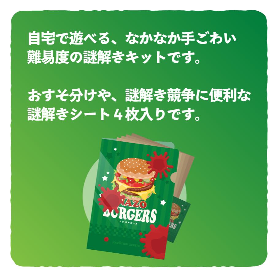 架空のハンバーガーショップ「ナゾバーガーズ」のトレイシートがコンセプトの、初心者向け謎解きです。